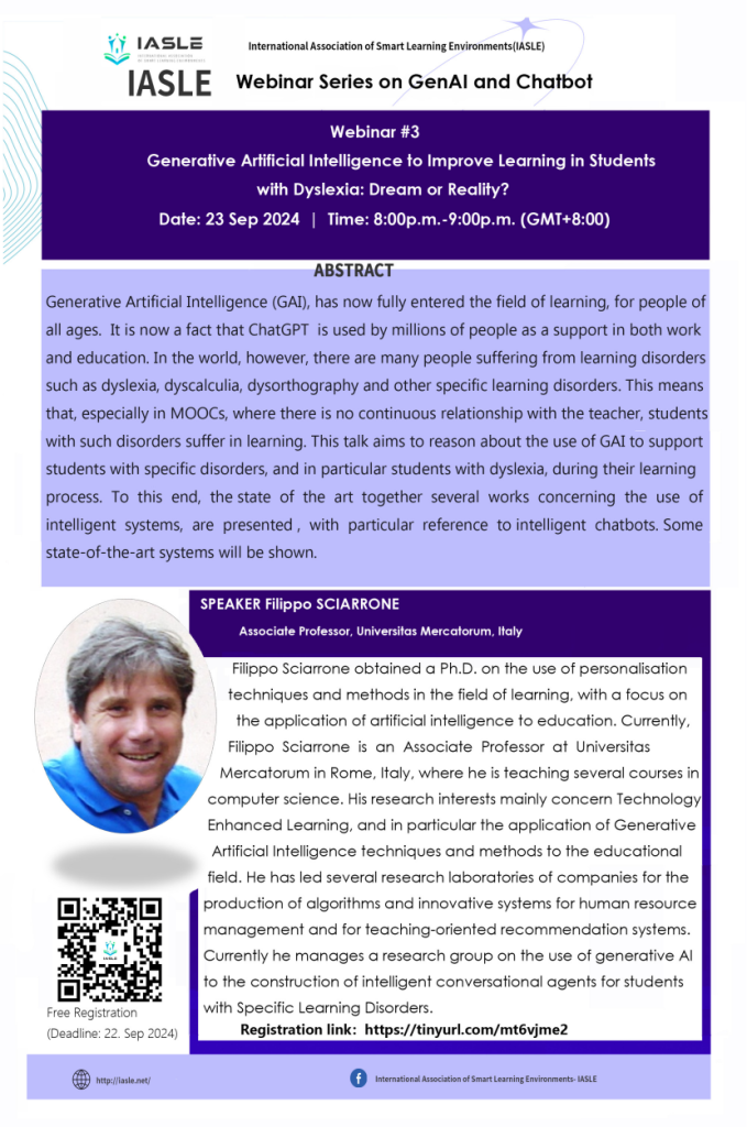 Generative Artificial intelligence (GAl), has now fully entered the field of learning, for people at all ages, it is now a fact that ChatGPT is used by millions of people as a support in both work and education. In the world, however, there are many people suffering from learning disorder.such as dyslexia, dyscalculia, dysorthography and other specific learning disorders. This means that, especially in MOOCs, where there is no continuous relationship with the teacher, students with such disorders suffer in learning, This talk aims to reason about the use of GAl to support students with specific disorders, and in particular students with dyslexia, during their learning process. To this end, the state of the art together several works concerning the use of intelligent systems, are presented , with particular reference to intelligent chatbots, Some state-of-the-art systems will be shown.